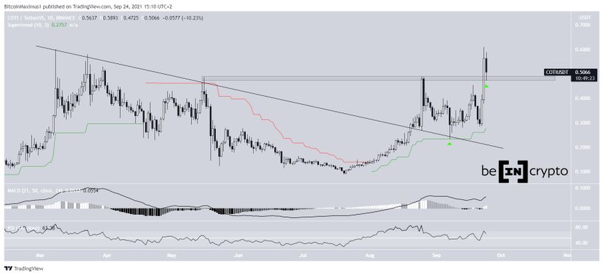SponsoredС того момента COTI начал расти и 20 августа совершил бычий пробой линии нисходящего сопротивления. 7 сентября цена превратила ее в поддержку и возобновила рост, обновив 23 сентября исторический максимум.