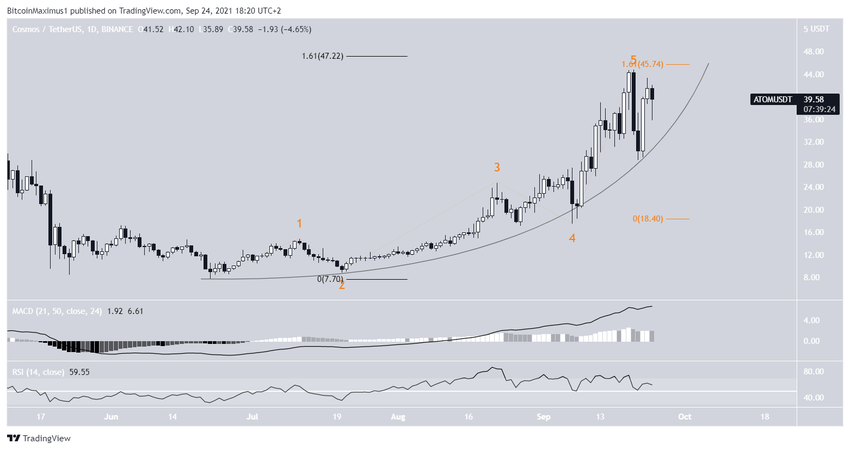 Курс ATOM с 22 июня двигался вдоль линии параболической восходящей поддержки. В итоге цена выросла 20 сентября к историческому максимуму на $44.8.