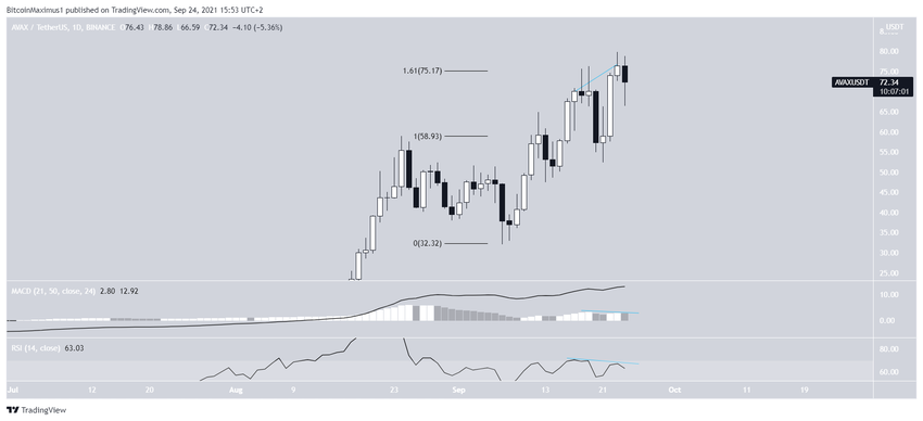 AVAX тоже продолжает расти уже с 7 сентября. Это позволило рынку сформировать 23 сентября исторический максимум на $79.8.