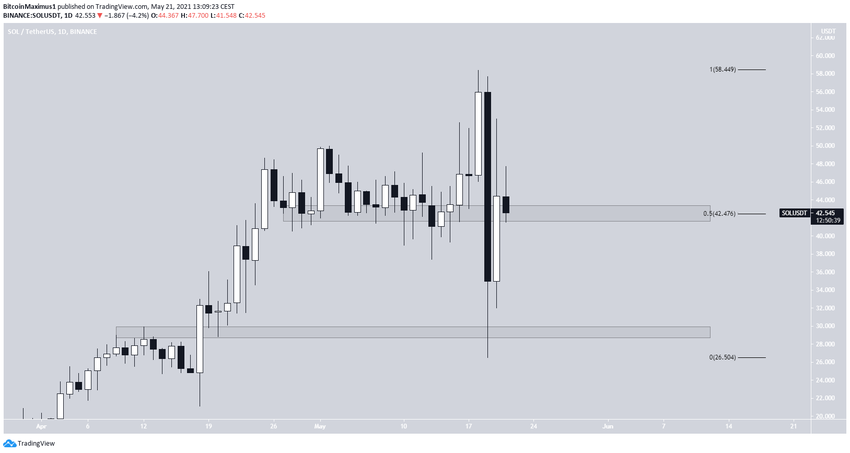 SOL снижается с 18 мая, после достижения максимума на уровне $58,38. Как и MATIC, на следующий день на графиках сформировалась свечная модель «медвежье поглощение».