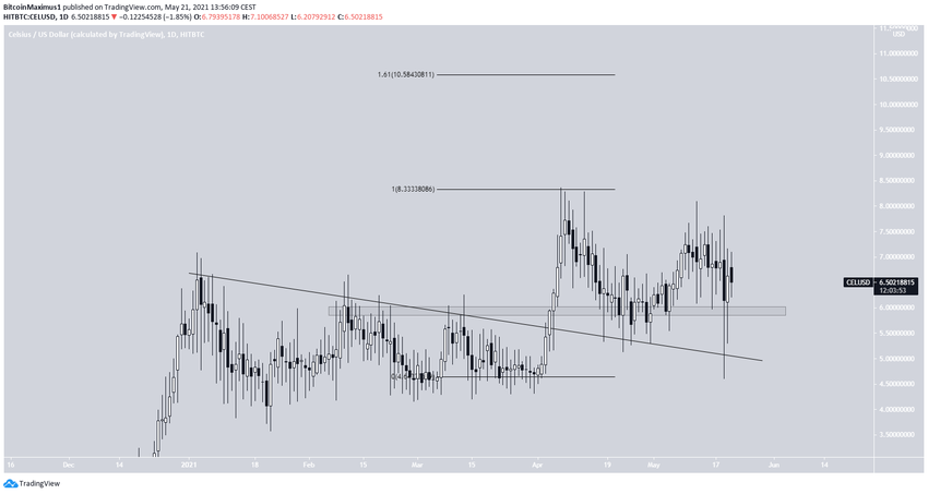 CEL пробил линию нисходящего сопротивления 4 апреля и спустя три дня обновил максимум на уровне $8,36. С тех пор цена дважды возвращалась к пробитому сопротивлению, тестируя его в качестве поддержки. Последний раз это произошло 19 мая.