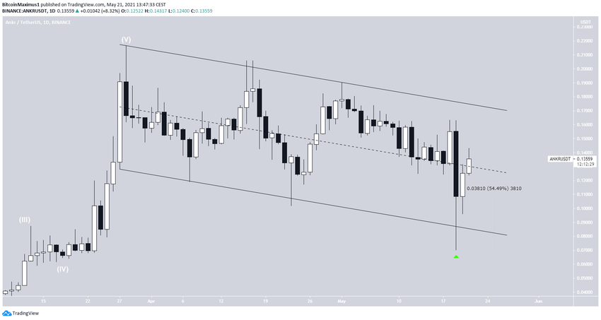ANKR снижается с 28 мая, после достижения максимума на уровне $0,21. Как и в случае с HNT, цена движется в пределах нисходящего параллельного канала.