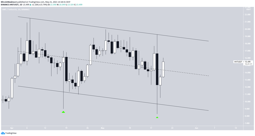 HNT достиг исторического максимума 7 апреля на уровне $21,5 и с тех пор снижается внутри нисходящего канала. Нисходящие параллельные каналы обычно формируются во время коррекции.