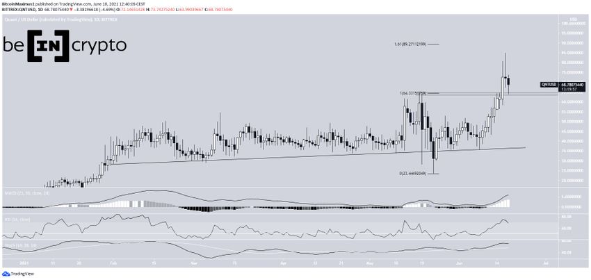 Токен QNT оттолкнулся от долгосрочной восходящей линии поддержки 23 мая. С тех пор цена стабильно растет. Токен достиг нового исторического максимума 17 июня на уровне $84,92. Эта отметка близка к 1,61 коррекции Фибоначчи на уровне $89,27.
