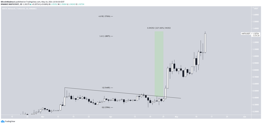 MATIC совершил 26 апреля бычий пробой линии нисходящего сопротивления и с тех пор укреплялся. Цена выросла на 227%, обновив 14 мая исторический максимум на $1.356.