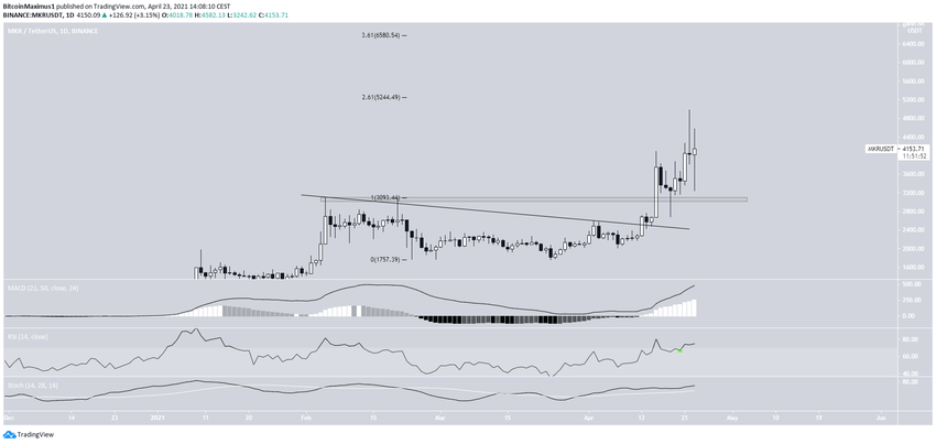 MKR рос с момента прорыва нисходящей линии сопротивления 12 апреля. Вскоре после этого цена вернулась в область выше $3 100, которая теперь служит поддержкой.