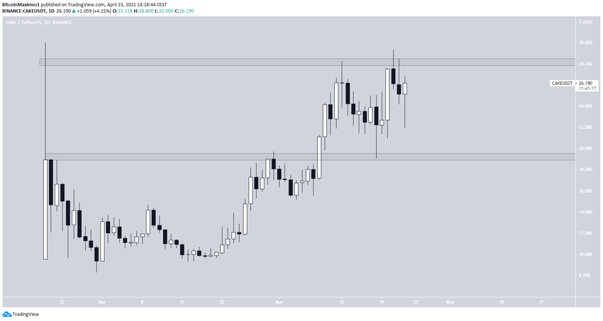 CAKE растет с 8 апреля, после прорыва сопротивления на уровне $19. Цена дважды пыталась преодолеть сопротивление $28,20 — 12 и 21 апреля — но пока безуспешно.