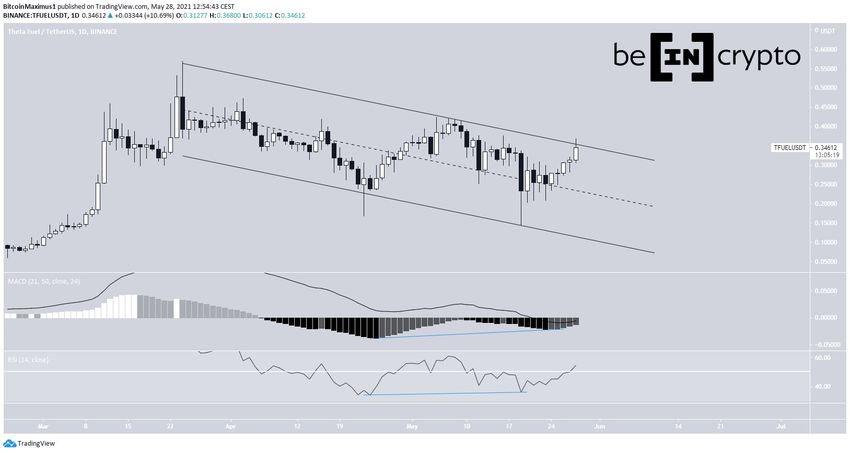 TFUEL достиг исторического максимума 24 марта на уровне $0,568. и с тех пор торгуется внутри нисходящего параллельного канала. Подобные паттерны обычно формируются во время коррекции. Цена достигла линии поддержки 19 мая и начала восстанавливаться.