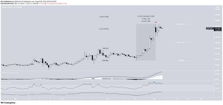 QNT рос ускоряющимися темпами с 20 июля. За 13 дней коин подорожал на 232% и обновил 2 августа исторический максимум на $187. Этот максимум был сформирован в непосредственной близости от уровня Фибо 2.61 внешней коррекции (черный цвет).