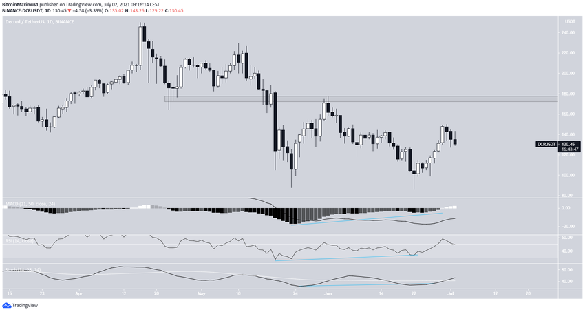 Курс DCR сформировал 23 мая и 22 июня двойное основание в районе поддержки $85. Двойное основание традиционно считается паттерном бычьего разворота.