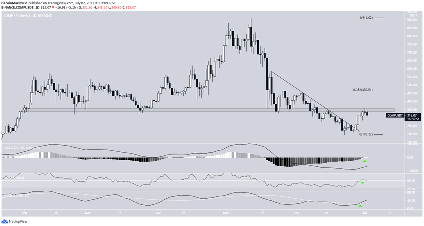 Курс COMP достиг 23 мая минимума на $267.55 и затем отскочил от него. В процессе этого хода цена протестировала в качестве поддержки горизонтальную область $350.