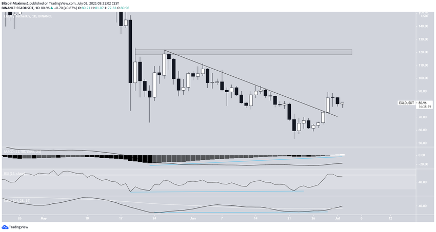 После этого EGLD совершил бычий пробой вышеупомянутой линии нисходящего сопротивления. Ближайшее сопротивление располагается на $120.