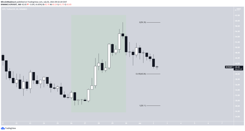Курс ICP достиг 26 июня исторического минимума на $28.26. После этого цена начала расти в рамках фазы, которую можно расценивать как импульсную (выделено зеленым цветом на графике).