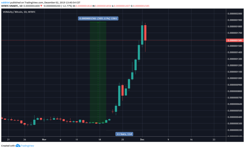 20 ноября VRA отметил минимум на 307 сатоши и вскоре начал развивать восходящее движение. Буквально за 11 дней токен подорожал на целых 5055, отметив максимум 1876 сатоши 1 декабря.