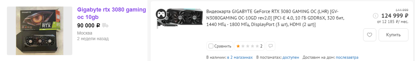 Интерес к видеокартам на вторичном рынке может обусловливаться высокими ценами на оригинальную продукцию. Стоимость оригинальной GIGABYTE GeForce RTX 3080 с памятью объемом в 10Гб сейчас составляет ~₽125 тыс. На вторичном рынке такие же карты можно найти за ₽90 тыс.