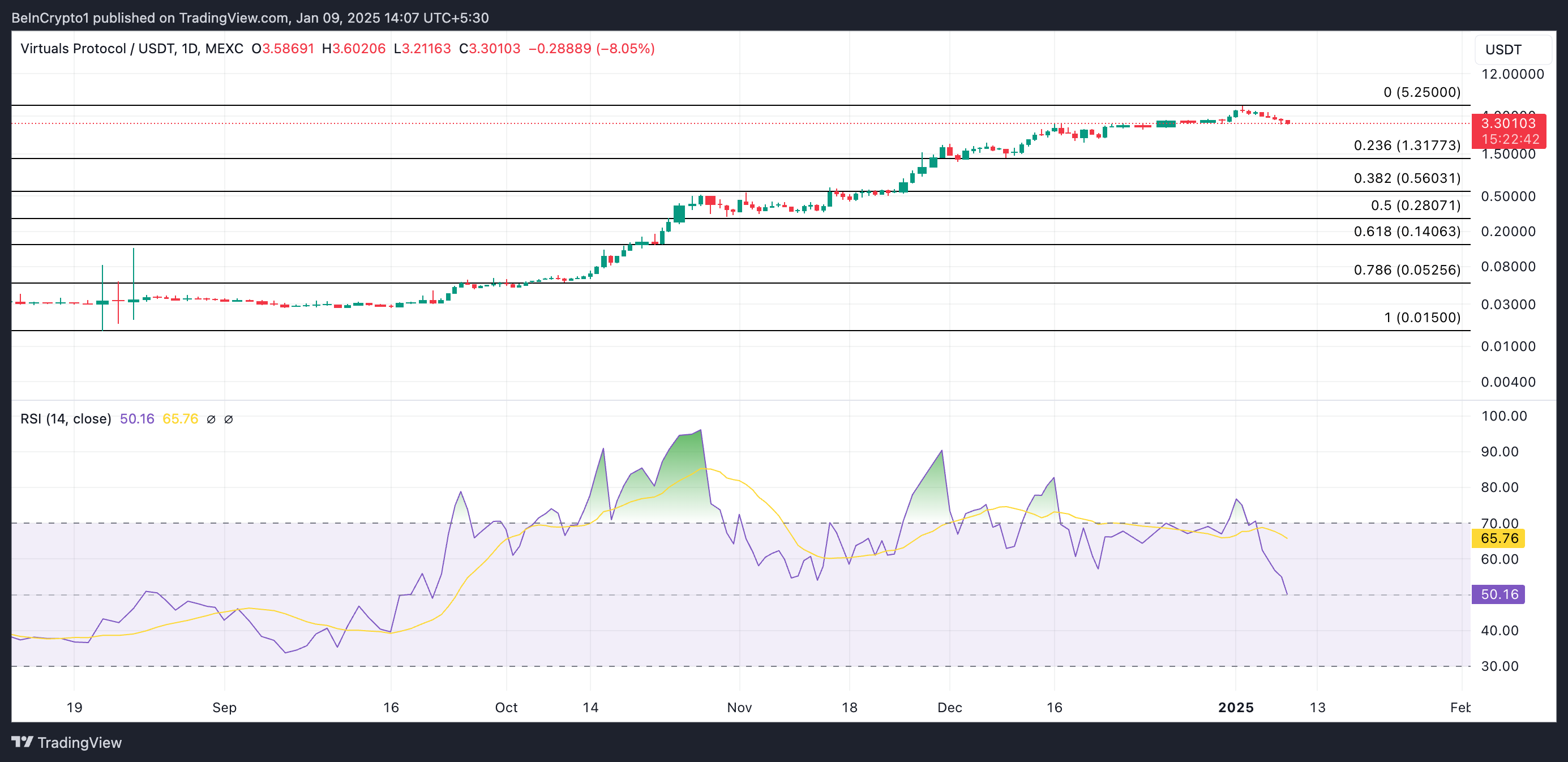 Токен VIRTUAL достиг рекордного максимума на $5,25 2 января. Однакос тех пор он резко упал, потеряв 35% за последнюю неделю