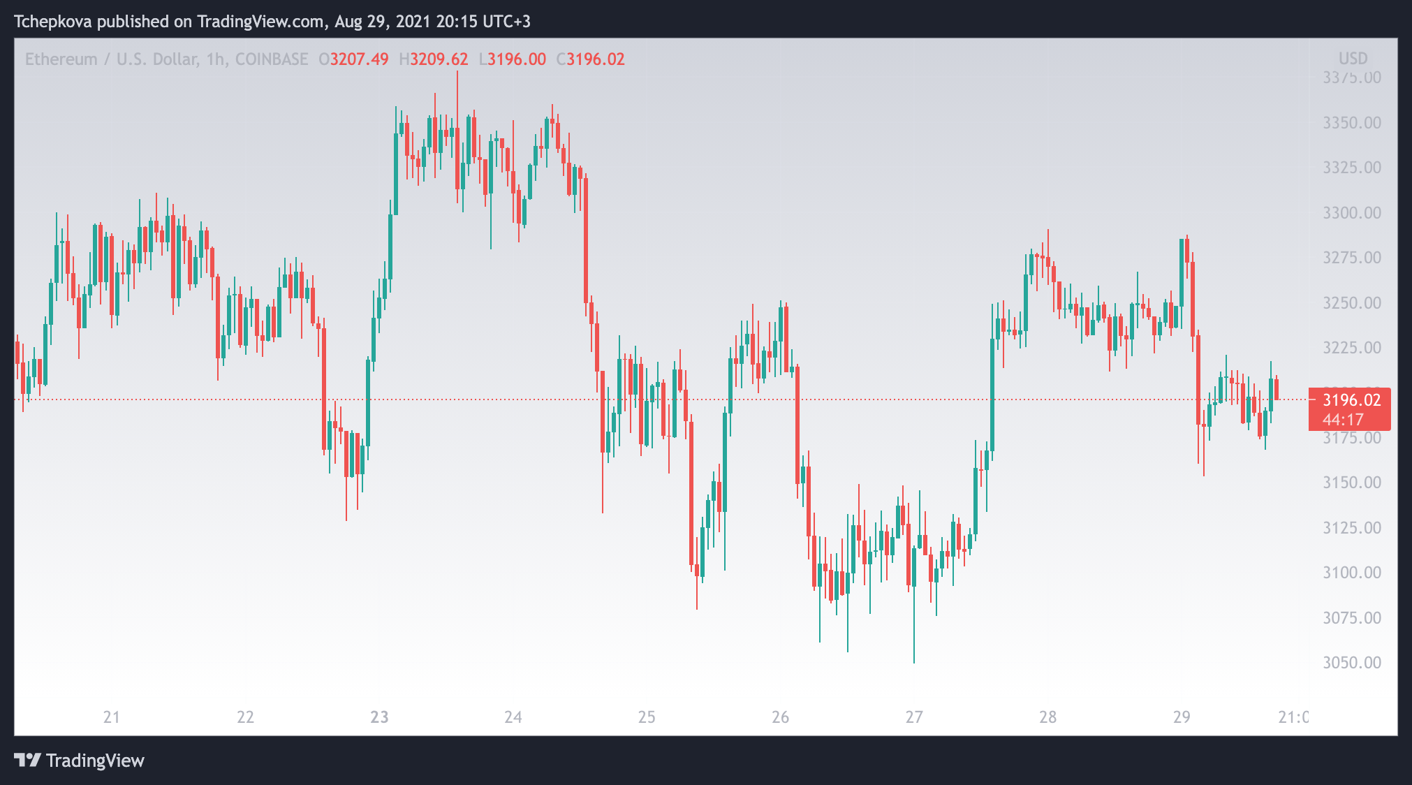 Ethereum на этой неделе двигался вслед за биткоином. Вторая по величине криптовалюта протестировала максимум на уровне $3 378 в понедельник 23 августа, но к пятнице спустилась до $3 092. Затем ETH дважды пытался преодолеть $3 300, но так и не преуспел. На момент написания статьи, ETH/USD торгуется на уровне $3 200, не изменившись по итогам недели.