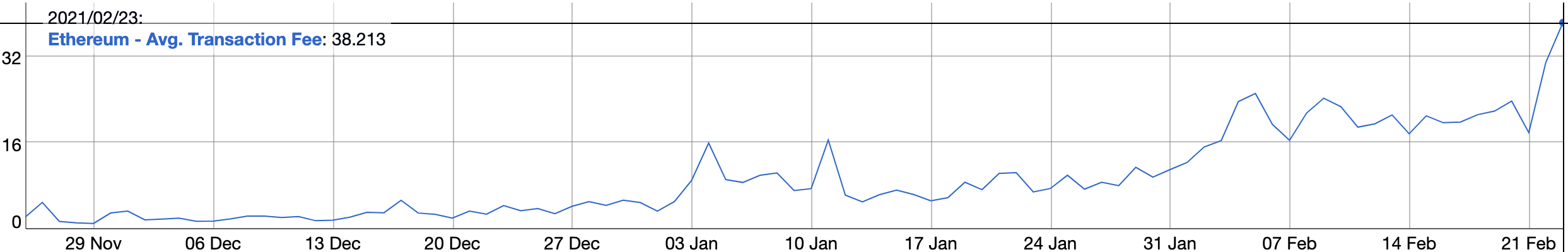 Доходы майнеров в сети Ethereum экспоненциально растут вместе с ценой на газ. По данным BitInfoCharts, сегодня средняя комиссия за транзакцию обновила очередной рекорд, приблизившись к $40.
