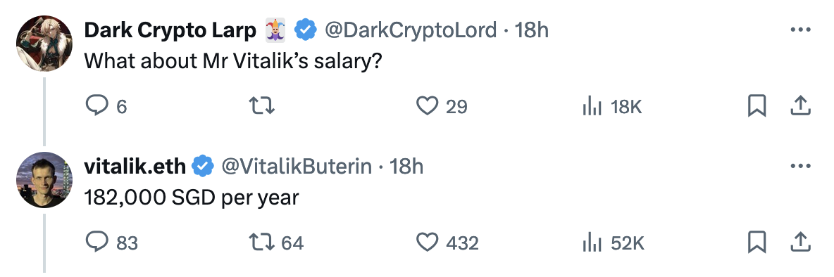 Размер зарплаты Бутерина шокировал криптосообщество, но в хорошем смысле. Пользователь под ником Dark Crypto Larp, которому и ответил Виталик, написал: