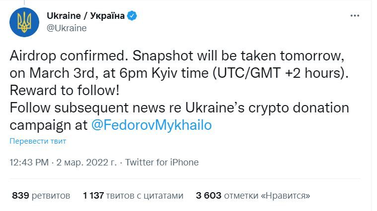 «Подтверждение аирдропа. *Снапшот будет сделан завтра, 3 марта, в 6 утра по киевскому времени (UTC/GMT +2 часа), — написали представители властей Киева, призвав подписчиков следить за обновлениями в микроблоге министра цифровой трансформации Украины Михаила Федорова.