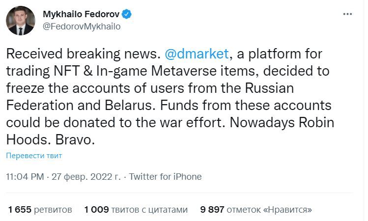 «Платформа для торговли NFT и предметами в игровых метавселенных DMarket приняла решение заморозить аккаунты пользователей из России и Республики Беларусь. Активы из аккаунтов могут быть использованы в качестве пожертвований на военные нужды», — написал министр цифровой трансформации Украины в своем микроблоге.