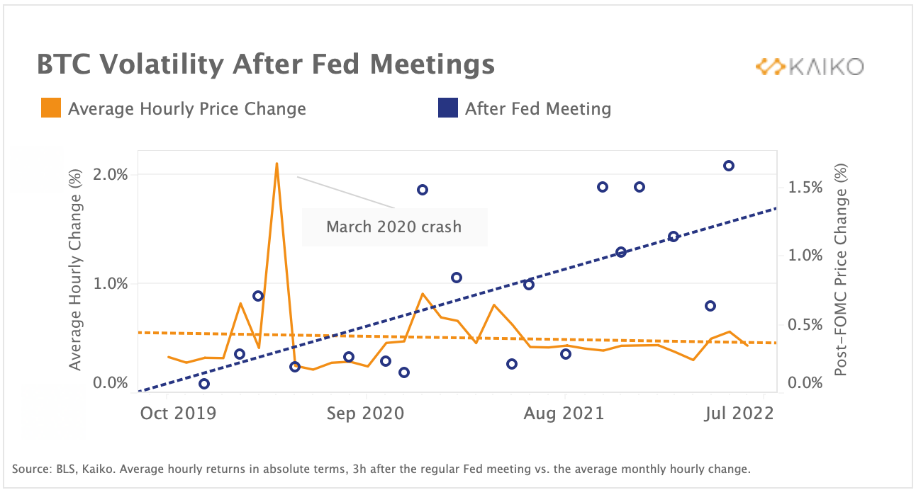 Как полагают в Kaiko, в ближайшие месяцы крипторынок будет еще острее реагировать на публикацию рыночной статистики и выступления центральных банков, поскольку и ФРС, и Европейский центральный банк отказываются от прогнозов и принимают решения по денежно-кредитной политике, исходя из фактических данных.