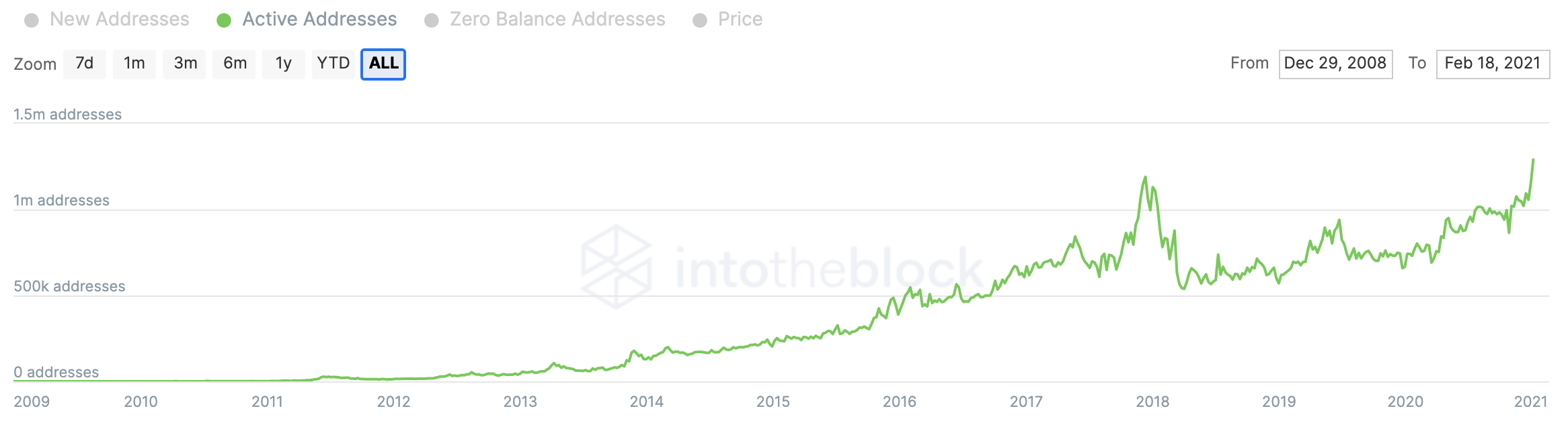 Число новых биткоин-адресов приблизилось к историческим максимумам, достигнутым в конце 2017 года, при этом число активных адресов достигло рекордных значений на уровне 1,29 млн. Предыдущий рекорд был достигнут в декабре 2017 года на уровне 1,19 млн.