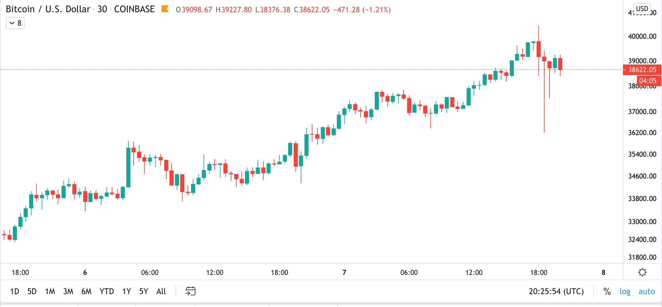На рынок криптовалют вернулась волатильность: биткоин в течение часа взлетел к новым историческим максимумам выше $40 400 и рухнул к $36 000