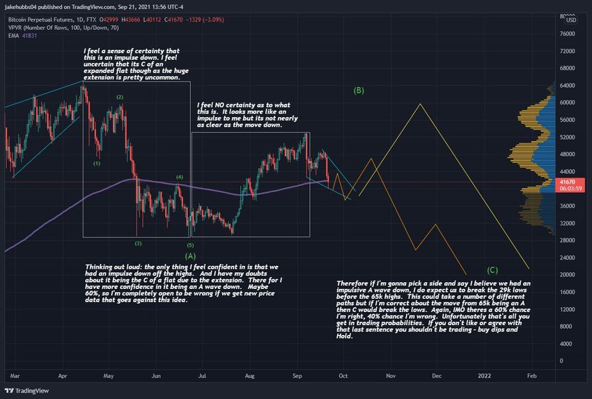 Единственное что можно утверждать сейчас с полной уверенностью, рассматривая динамику BTC в рамках волнового анализа – это то, что снижение от исторического максимума, отмеченного 14 апреля (выделено на графике) представляет собой пятиволновую медвежью импульсную структуру. Однако остается неясным, имеем ли мы дело с волной С (белый цвет) или с началом нового медвежьего импульса.