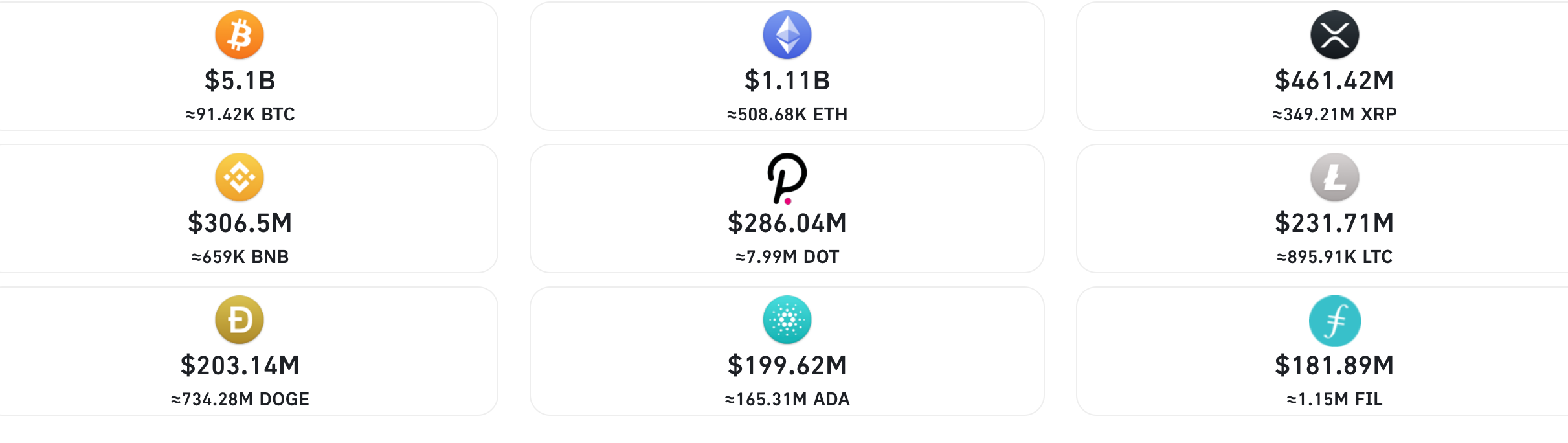 Львиная доля ликвидаций пришлась на биткоин, но и другие монеты тоже изрядно пострадали. За сутки ликвидировались позиции по ETH на сумму $1,1 млрд. По XRP объем ликвидаций достиг $461 мл.