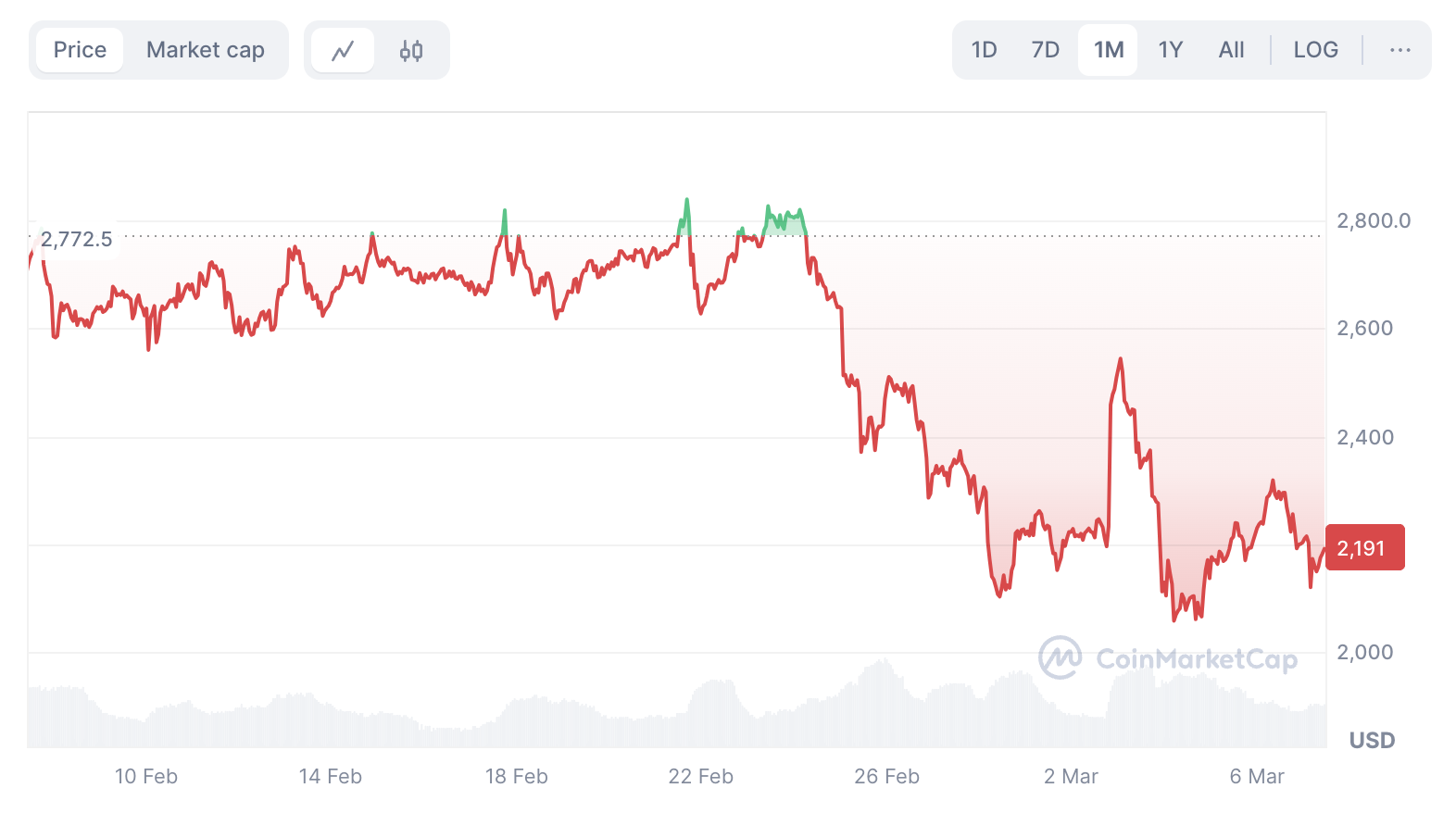 По данным CoinMarketCap, на момент написания этого материала ETH торгуется по $2 192. За последние сутки цена криптовалюты просела на 4%.