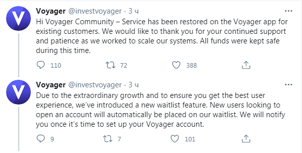 «В связи с невероятным ростом числа заявок и для обеспечения максимального удобства пользователей мы ввели функцию листа ожидания. Новые пользователи, желающие открыть счет, автоматически помещаются в лист ожидания. Мы сообщим вам, как только придет время настроить вашу учетную запись Voyager», — говорится в заявлении компании.