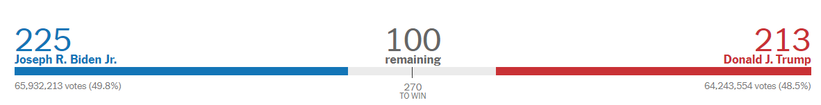 Тем временем Трамп уже заявил о готовности идти в Верховный суд в случае необходимости решения вопроса об итогах выборов. На момент написания материала кандидат от демократов Джо Байден опережает действующего президента США на 1,3%.