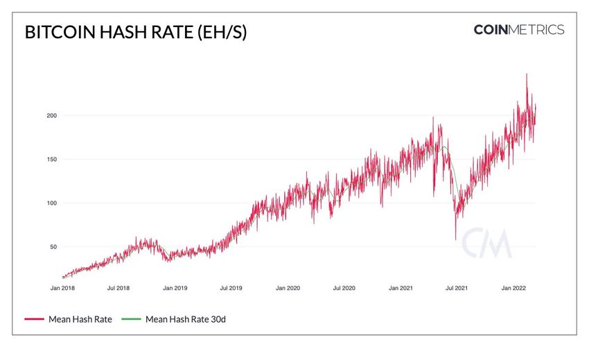 По мнению аналитиков Coin Metrics, хешрейт растет, потому что биткоин дорожает, и майнеры охотнее подключаются к сети. Однако скорость хеширования растет медленнее, чем цены на главную криптовалюту.