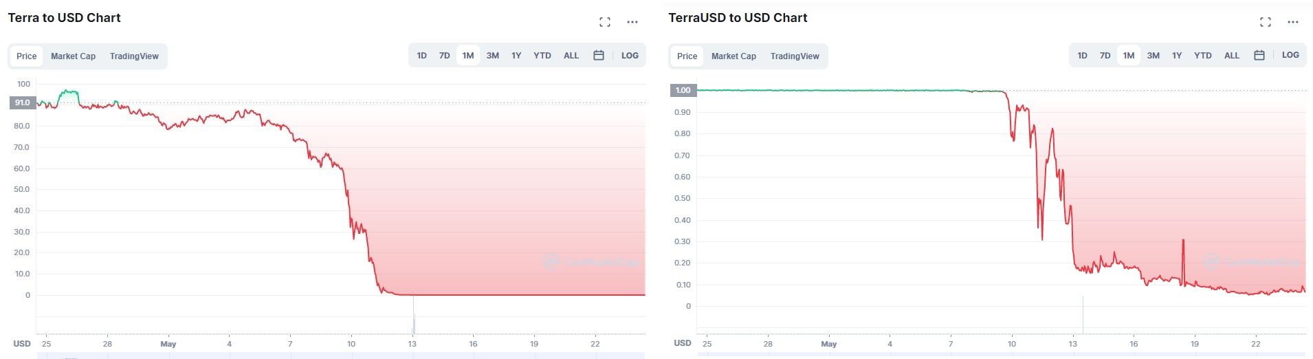 В начале мая 2022 года алгоритмический стейблкоин TerraUSD (UST) криптопроекта Terra потерял привязку к доллару США. За стабилизацию курса «стабильной монеты» отвечал нативный токен платформы – LUNA. В результате потери паритета UST с долларом США, обе монеты вышли в падение. Подробная хронология событий — по ссылке.