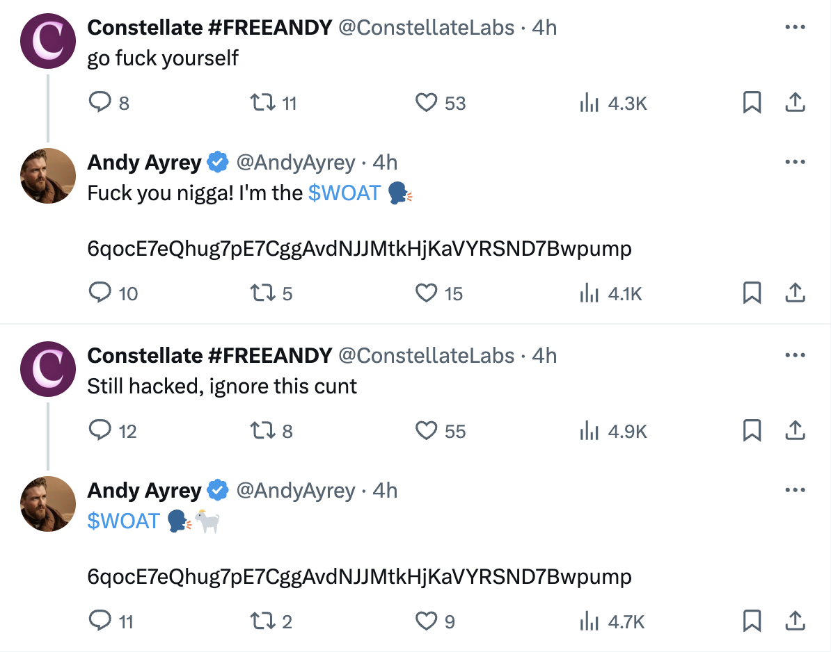 Айрей сообщил, что ему удалось восстановить доступ к своему аккаунту, но временно. В твите он отметил, что злоумышленник взломал профиль с помощью подмены SIM-карты. Вскоре после этого сообщение создателя Truth Terminal о взломе удалили и начали публиковать скам.