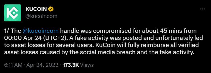 В понедельник, 24 апреля, твиттер-аккаунт криптовалютной биржи KuCoin стал жертвой хакерской атаки. Об этом представители торговой площадки сообщили в социальных сетях.