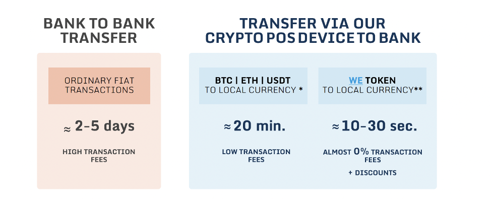 Интеграция POS снизит до 0% размер комиссий, выплачиваемых клиентами, поскольку они будут использовать собственные устройства от WE для совершения платежей или снятия наличных в фиатной валюте.