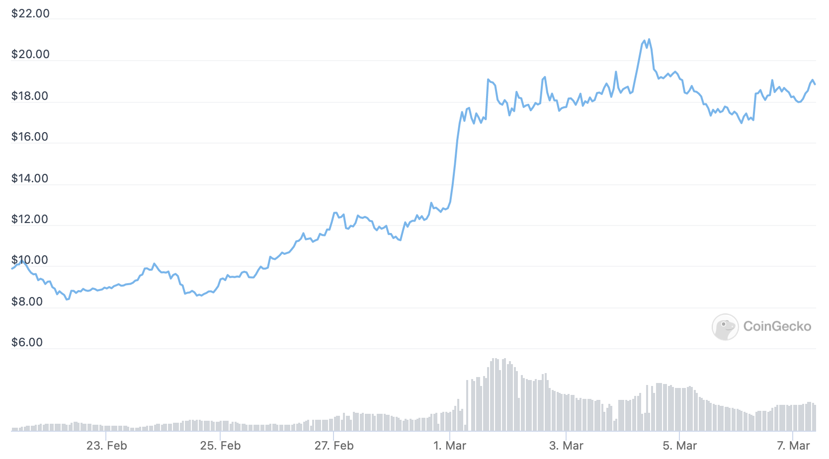 По данным CoinGecko, рыночная капитализация превысила $1,88 млрд, а среднесуточный объем торгов достиг $680 млн. Несмотря на стремительный рост, токен все еще на 56% ниже исторического максимума, достигнутого в мае 2021 года на уровне $43.