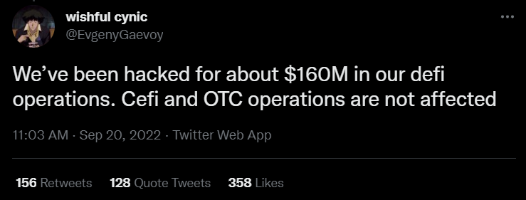 Проект по децентрализованному маркетмейкенгу Wintermute лишился $160 млн в криптовалютах из-за хакерской атаки. Об этом у себя на странице в твиттере сообщил глава площадки Евгений Гаевой. Он не уточнил природу взлома, но отметил, что сервисы по кредитованию и внебиржевой торговле не пострадали.