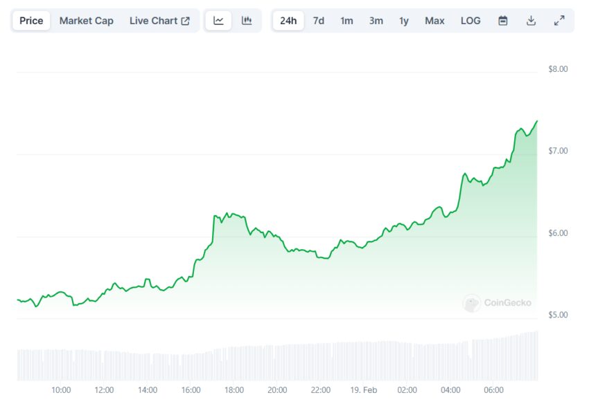 За прошедшие 24 часа стоимость монеты увеличилась на 42,7%. В недельном исчислении рост и вовсе составил 192,6%.