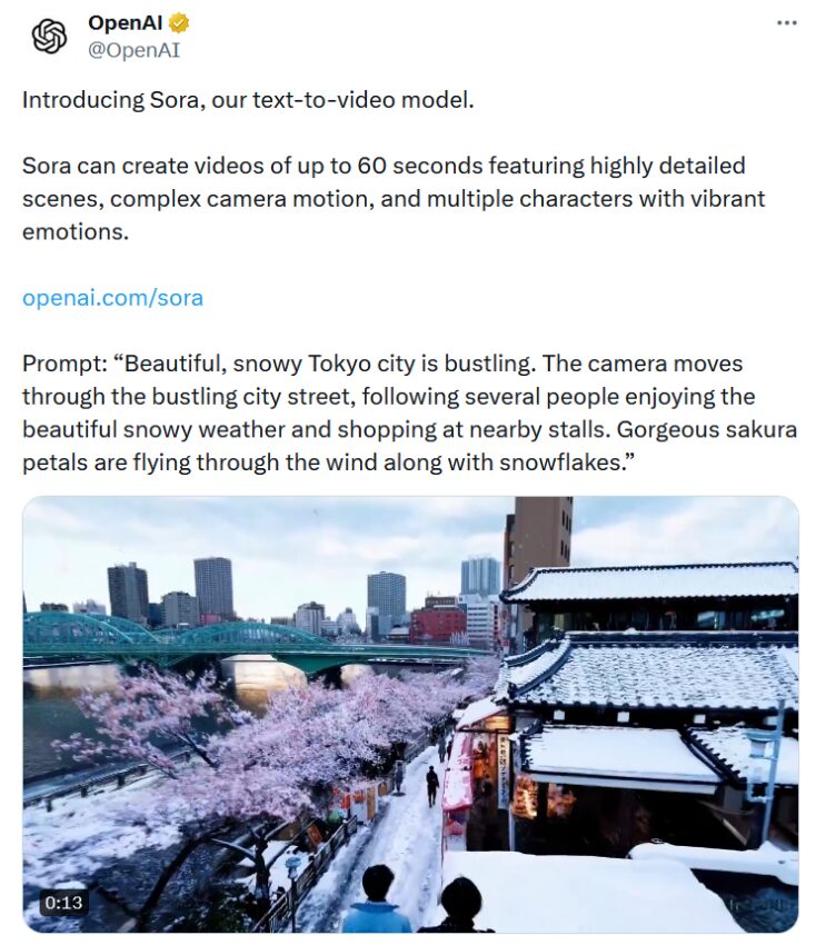 Несколькими днями ранее, 16 февраля, компания также представила нейросеть под названием Sora. Модель искусственного интеллекта (ИИ) позволяет генерировать видеоролики продолжительностью до 60 секунд из заданного текста.