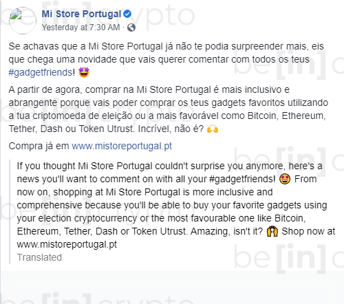 Официальный ритейлер Xiaomi в Португалии Mi Store Portugal заинтересован в криптовалютных платежах. Ритейлер сообщил об этом у себя в Facebook. Сейчас анонс удален, однако объявление сохранилось в кэше.