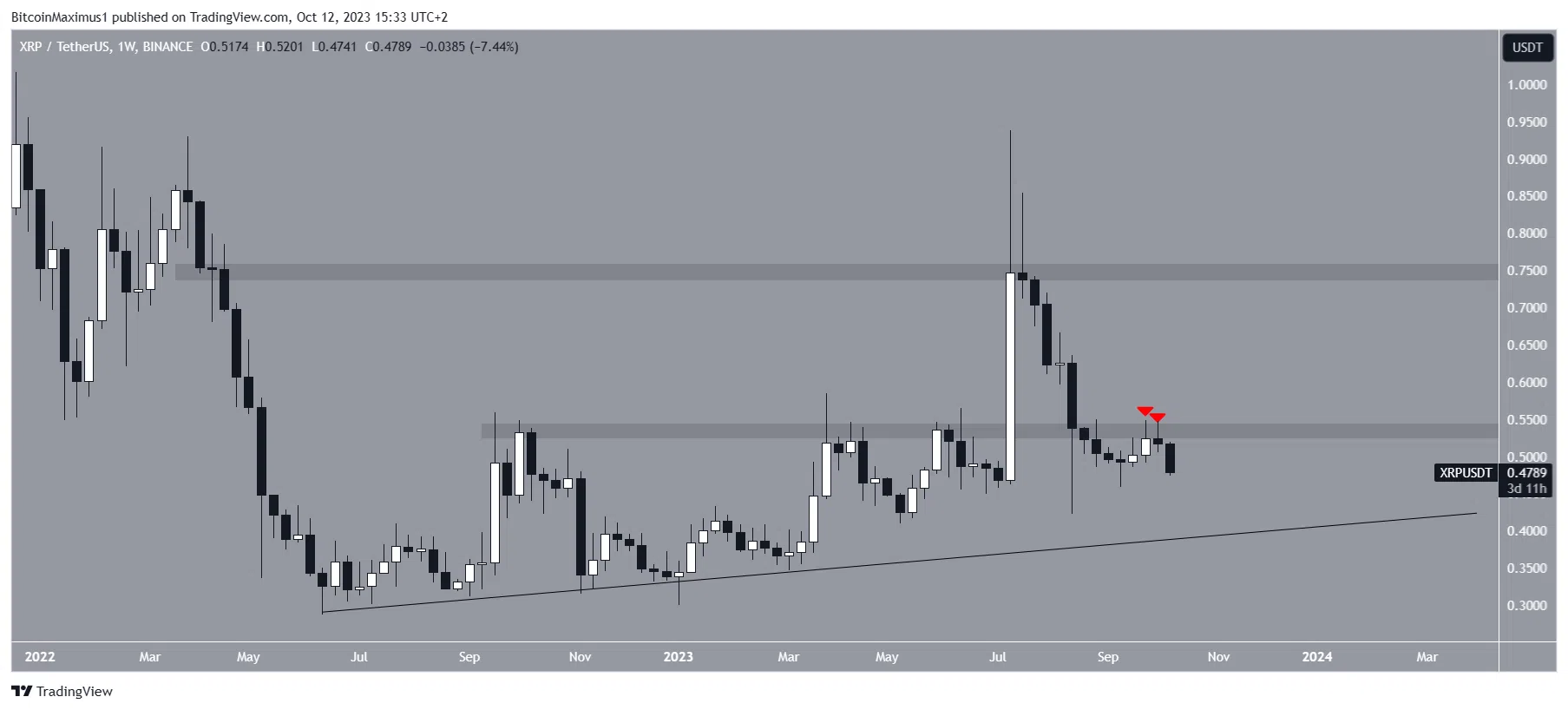 Технический анализ недельного таймфрейма показывает, что Ripple падает с момента достижения годового максимума в $0,94 в июле. Снижение привело к минимуму на уровне $0,42 и потере важной горизонтальной поддержки $0,53.