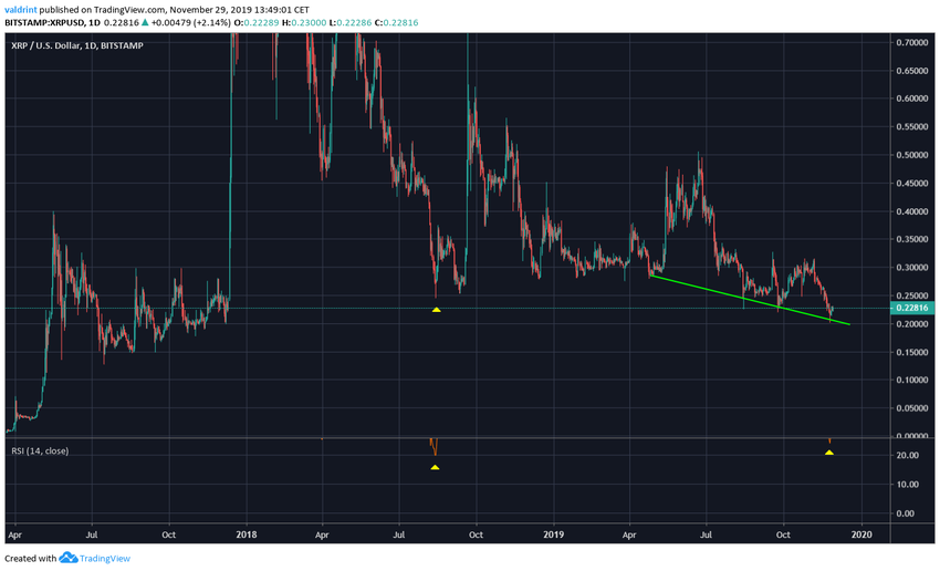 25 ноября с неизвестного кошелька перевели около 50 миллионов XRP на биржу Bitstamp. Изначально предполагалось, что это вызовет движения котировок, но ничего значимого в динамике токена так и не произошло – цена просто плавно опустилась в область нисходящей линии поддержки.