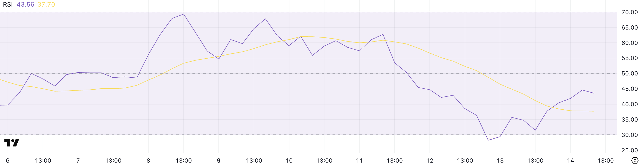 Индекс относительной силы (RSI) XRP поднялся до 43,56. Два дня назад показатель составлял 28,24. Этот индикатор измеряет скорость и величину недавних изменений цен на шкале от 0 до 100. Показатели ниже 30 указывают на перепроданность актива, а выше 70 — на перекупленность. Выход XRP из зоны перепроданности в нейтральную область — 40-50 — говорит о возвращении интереса покупателей, хотя явного бычьего сигнала пока нет.