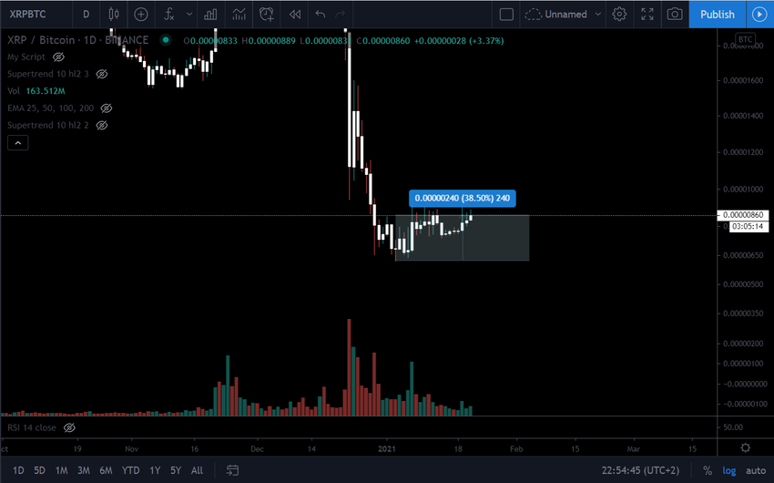 Налицо все признаки восстановления. Курс XRP по отношению к биткоину растет уже четвертый день подряд. Монета достигла дна три недели назад и с тех пор выросла почти на 39%.
