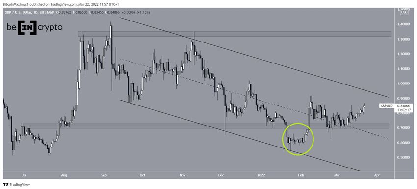 Сначала казалось, что коин нацелился на чистый медвежий прорыв ниже области горизонтальной поддержки $0.71 (зеленый круг). Однако после этого цена развернулась и начала рост. 7 февраля XRP совершил бычий прорыв этой области, а 28 февраля снова проверил ее на прочность, уже в качестве поддержки.