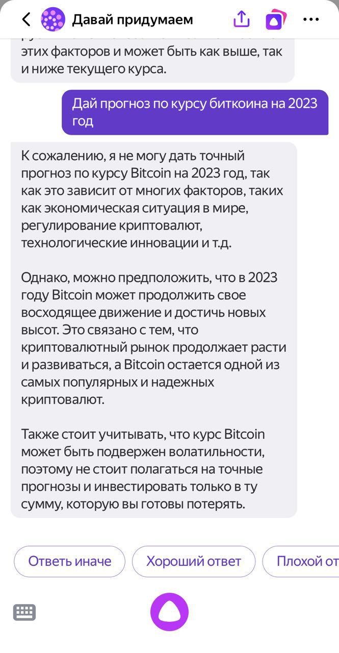 Например, при запросе прогноза курса биткоина (BTC) на 2023 год, нейросеть утверждает, что хоть и не может дать точный ответ, но предполагает, что криптовалюта «продолжит восходящее движение». В качестве условий для нового максимума цены биткоина, YandexGPT называет «рост и развитие криптовалютного рынка». Нейронная сеть также утверждает, что BTC «остается одной из самых популярных и надежных криптовалют».