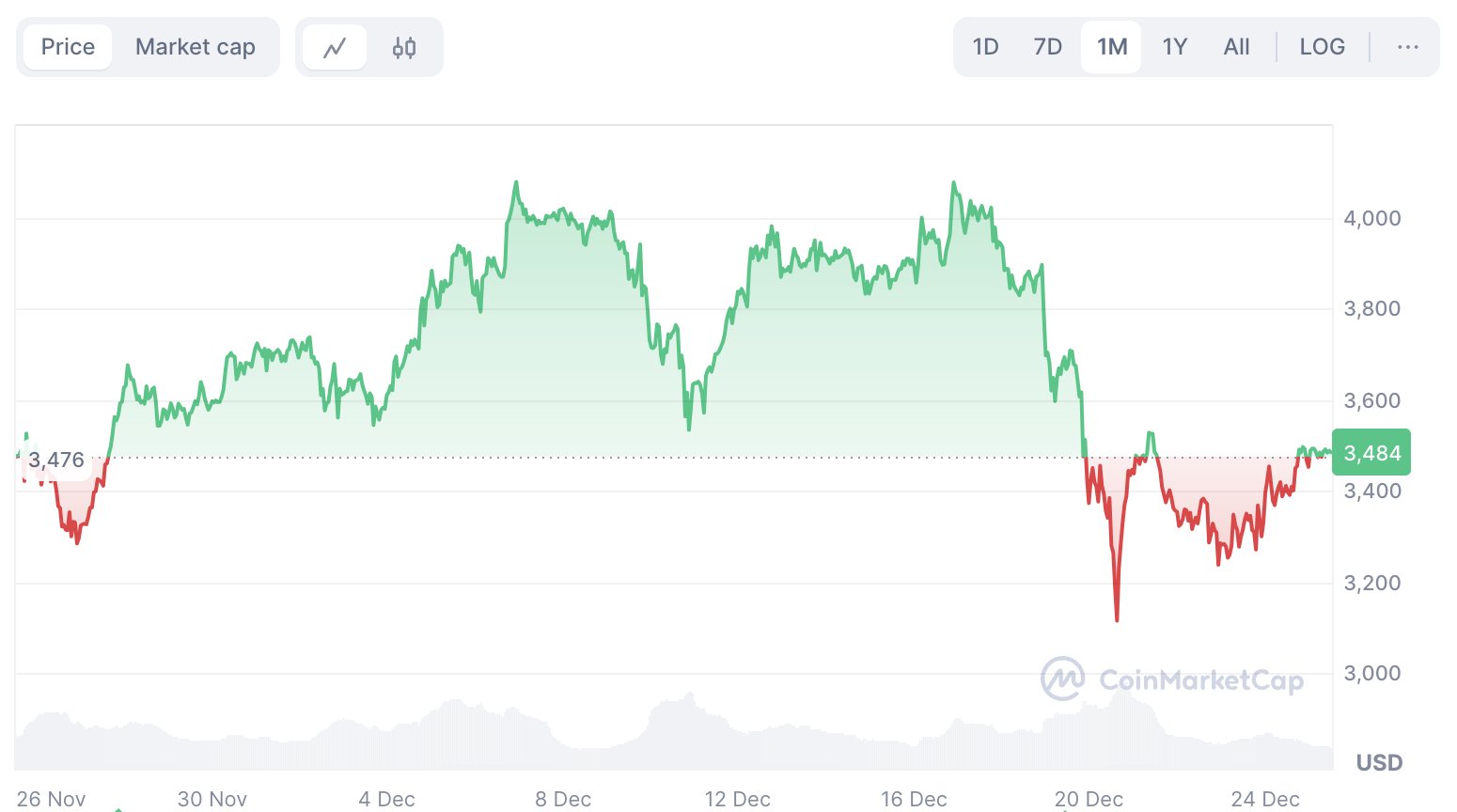 По данным CoinMarketCap, на момент написания материала Ethereum торгуется по $3 486. За прошедшие 24 часа стоимость второй по капитализации криптовалюты поднялась на 2,4%, в то время как за месяц — всего на 0,48%.